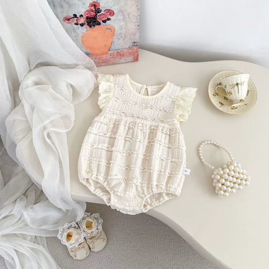 Summer Arrival Baby Girls Cute Fly Sleeves Crew Neck Solid Color Lace Striped Onesies