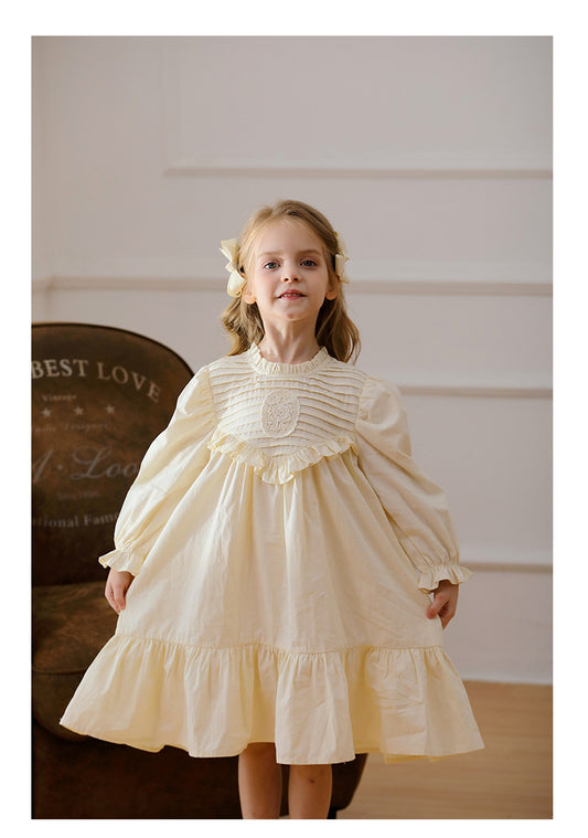 Hot Selling French Style Autumn Girls Flowers Embroidery Pattern Long Sleeves Pleated Dress