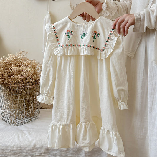 Hot Selling Autumn Girls Flowers Embroidery Pattern Long Sleeves French Style Dress