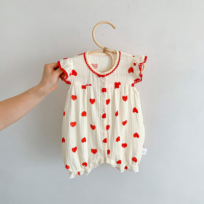 This summer romper features a charming red heart pattern and delicate fly sleeves, designed specifically for baby and toddler girls. Crafted for breathability and comfort, it allows ease of movement while maintaining a stylish, refined look. Ideal for warm days, this romper blends playful design with functional wearability, making it a timeless addition to your child’s wardrobe.