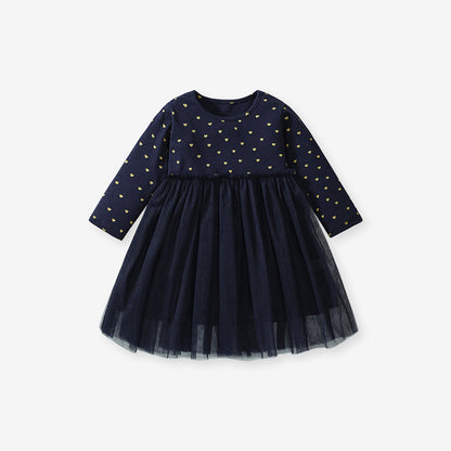 Design Autumn Girls Tiny Heart Print Crew Neck Long Sleeves Tulle Patchwork Dress