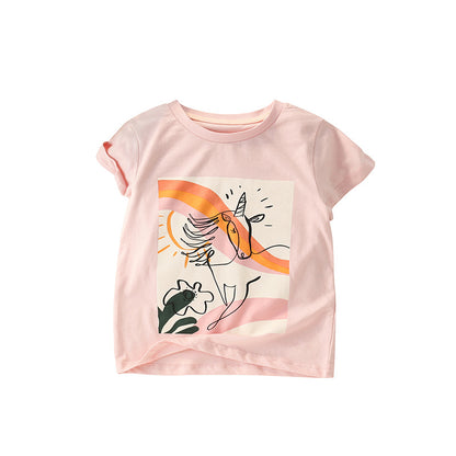 Girls’ Cartoon Unicorn Pattern Short Sleeves T-Shirt In European And American Style For Summer