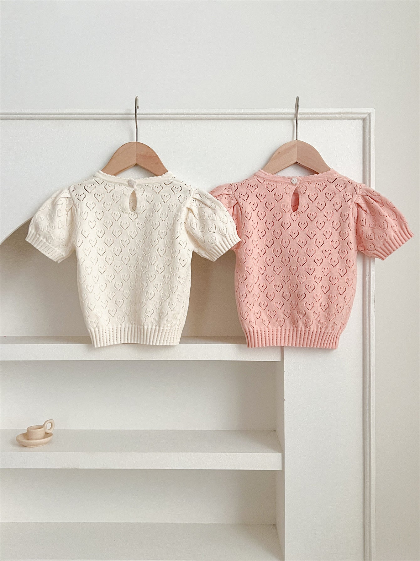 This delicate summer top features a finely knit fabric with a charming hollow-out heart pattern, perfectly blending breathability and style for young girls. Its short sleeves and lightweight design ensure comfort in warm weather, making it an elegant choice for everyday wear or special occasions. The soft texture offers gentle touch against delicate skin, combining sophistication with practical comfort for your child.