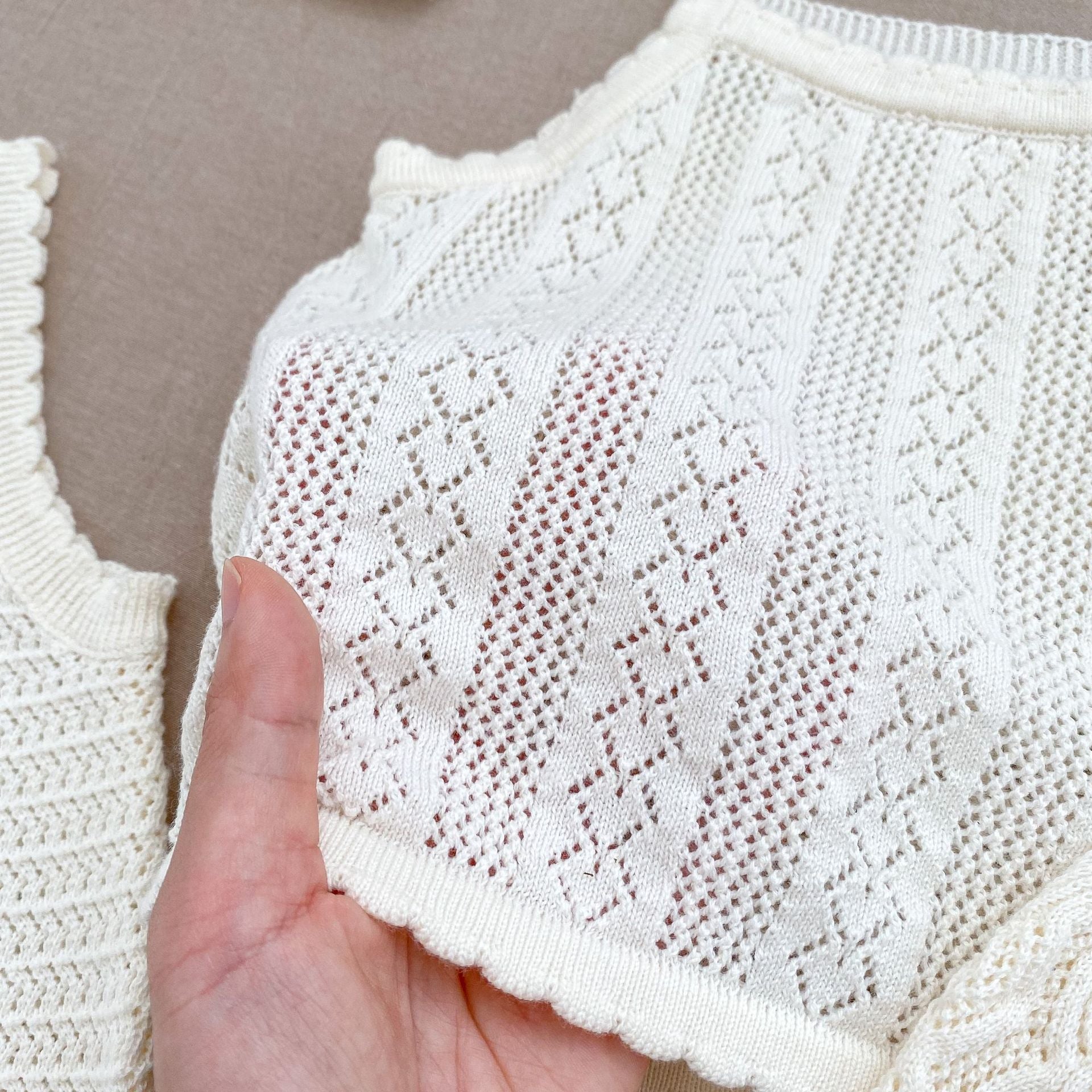 This finely crafted sleeveless vest for baby girls combines delicate knitwork with a tasteful hollow-out design, offering lightweight comfort and breathability ideal for summer. Its refined texture ensures both style and ease, making it a graceful choice to keep your little one cool and elegant during warm days.