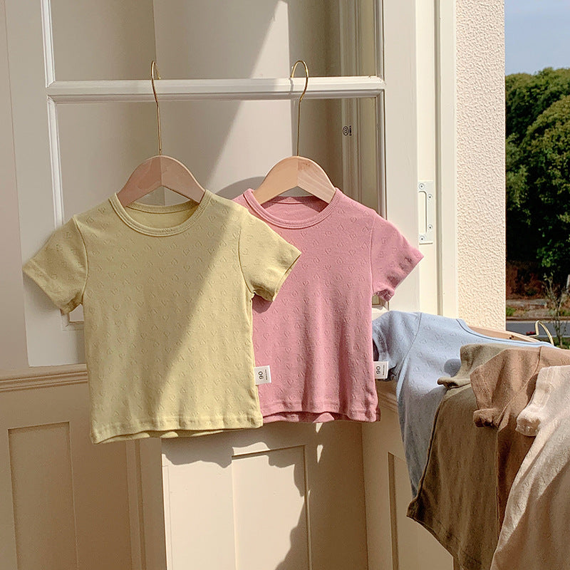 Design Kids Unisex Crew Neck Short Sleeves Solid Color Heart-Shaped Hollow Out Top