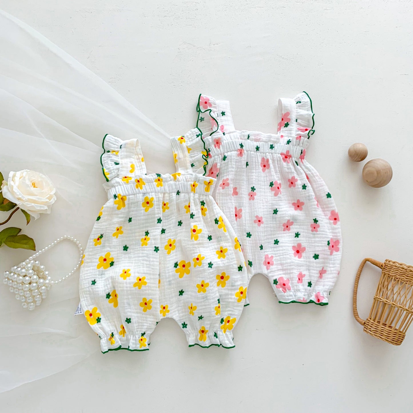 This sleeveless strap romper for baby girls features a charming pattern of flowers and stars, perfect for summer days. Crafted with lightweight fabric, it ensures comfort and breathability, keeping your little one cool and stylish. The delicate design adds a touch of elegance while allowing easy movement, making it an ideal choice for warm-weather outings.