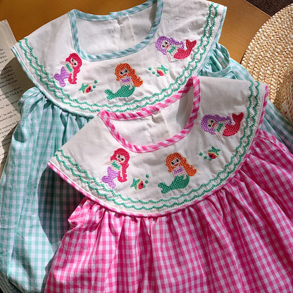 This sleeveless summer dress features a charming plaid pattern combined with delicate mermaid embroidery on the collar, creating a refined look for young girls. Crafted for comfort and style, its lightweight fabric keeps your child cool while the elegant design adds a touch of sophistication to any occasion. Perfect for warm days, this dress brings together classic detailing and playful charm effortlessly.