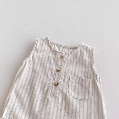 This unisex summer romper combines simplicity and style with its plain and striped pattern design. Crafted for comfort, it features a sleeveless cut and a classic crew neck, making it ideal for warm days. The lightweight fabric ensures breathability, allowing your little one to stay cool and comfortable throughout summer activities. Its refined, understated look suits any casual occasion, highlighting effortless elegance in children's wear.