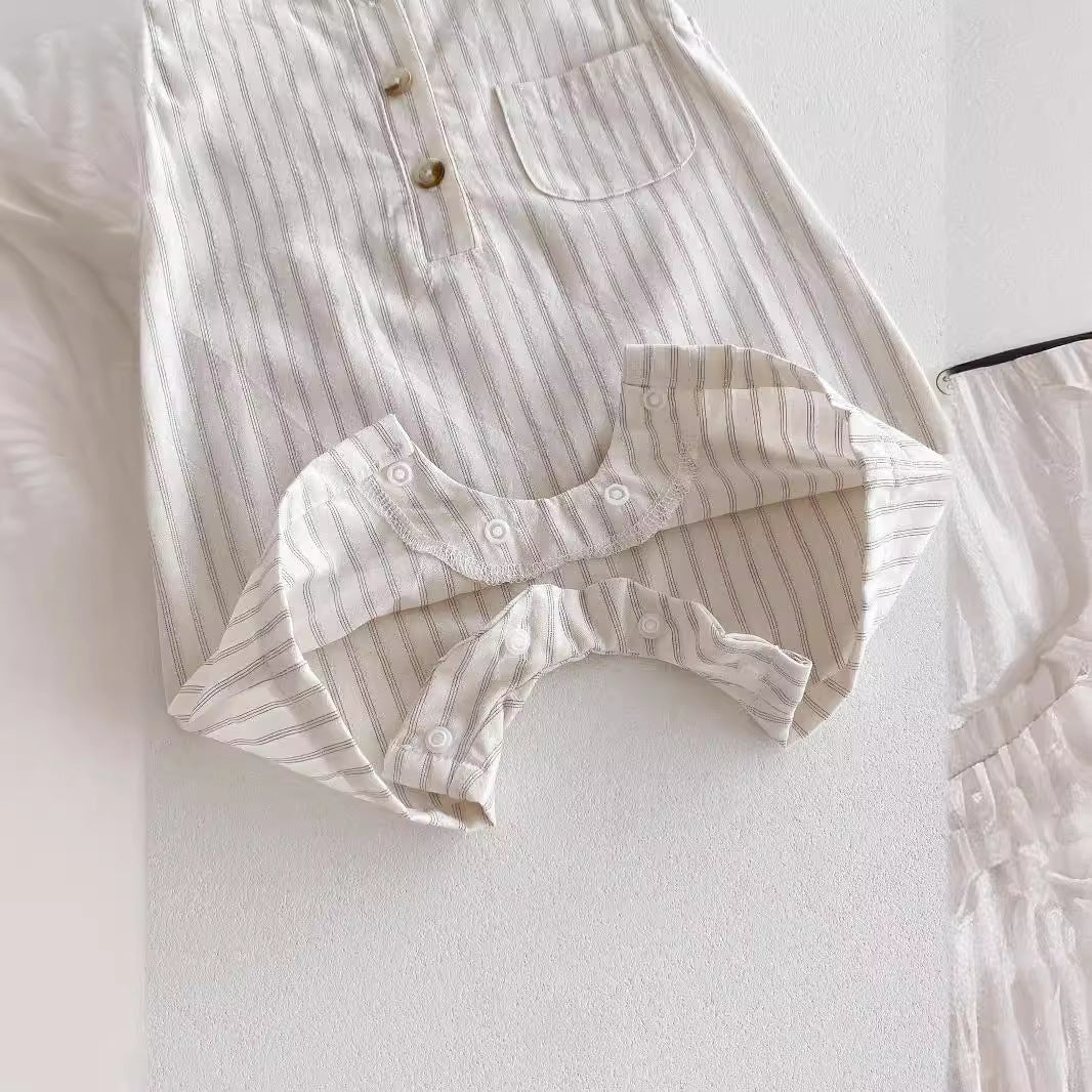 • 🌞 Unisex summer romper with a plain and striped pattern for a stylish, understated look.