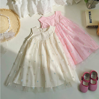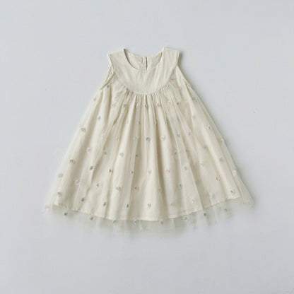 This elegant sleeveless mesh dress features delicate rose embroidery, perfect for summer occasions. Crafted with lightweight, breathable fabric, it ensures comfort while adding a refined touch to your child's wardrobe. A graceful choice for warm days and special events alike.