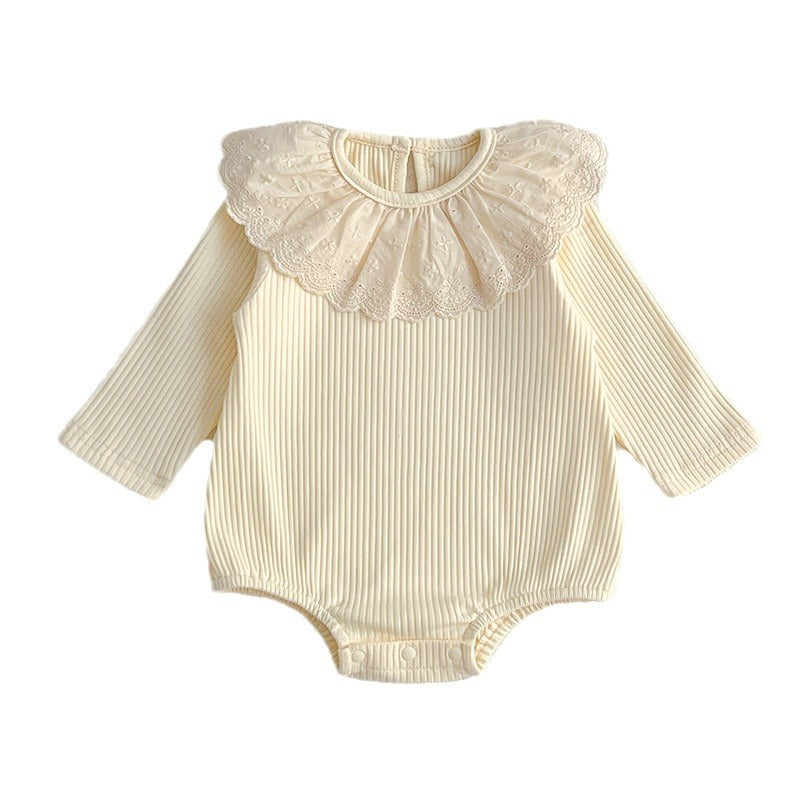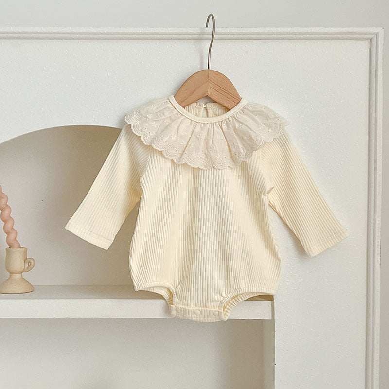 This elegant long-sleeve bodysuit in a soft, solid color is designed for baby girls welcoming spring. Featuring a delicate hollow-out collar, it combines subtle style with comfortable wear, perfect for gentle all-day use. The breathable fabric and thoughtful design ensure your little one stays cozy and charming during milder days.
