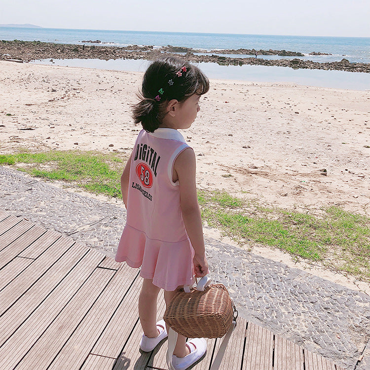 This sleeveless summer dress features a refined turndown collar and a sporty design accented with chic letter prints. Crafted for comfort and style, it ensures your baby girl stays cool and elegant during warm days. Its breathable fabric and tailored fit make it perfect for active play or casual outings with a touch of sophistication.