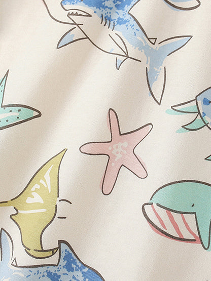 • 🐠 Under-the-Sea Fun – Features a vibrant cartoon marine animal print T-shirt that brings ocean adventures to life.