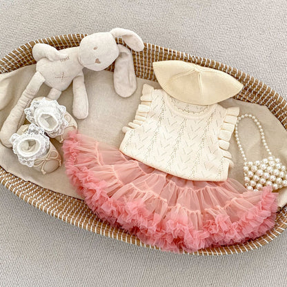 Dress your little one in breezy charm this summer with our playful two-piece set featuring a plain ruffle-sleeved vest with delicate hollow-out details and a whimsical ruffle mesh skirt. Perfect for sunny days and twirling fun, this outfit keeps her cool and stylish while adding a touch of sweet flair to her warm-weather wardrobe.