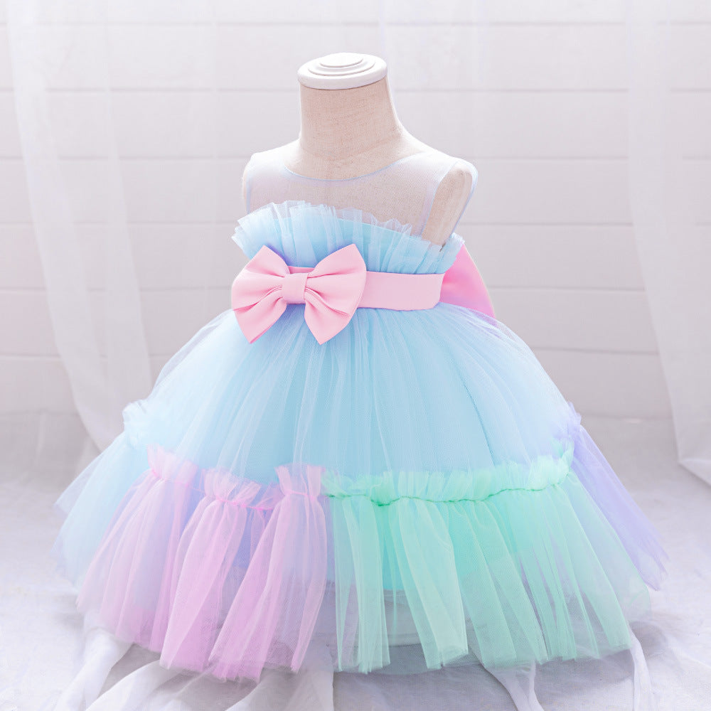 Summer Baby Kids Girls Princess Crew Neck Sleeveless 3D Butterfly Bow Colorful Mesh Dress