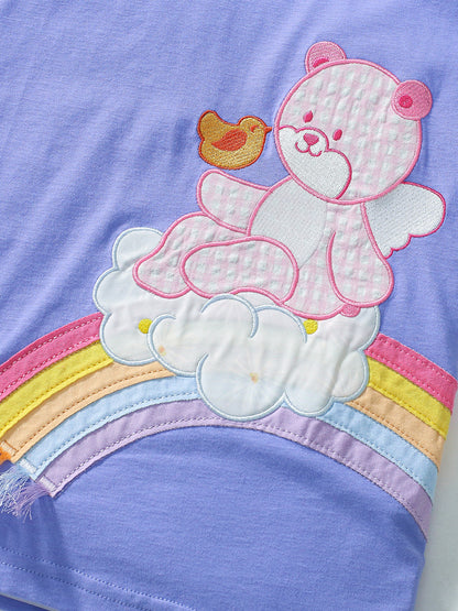• 🌈 Cheerful Rainbow Teddy Print: The short-sleeve T-shirt features a joyful rainbow teddy pattern that sparks imagination and smiles.