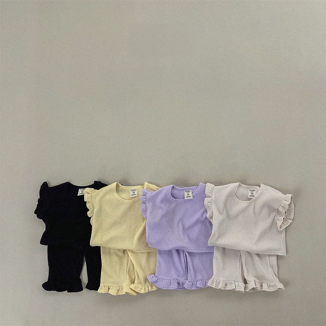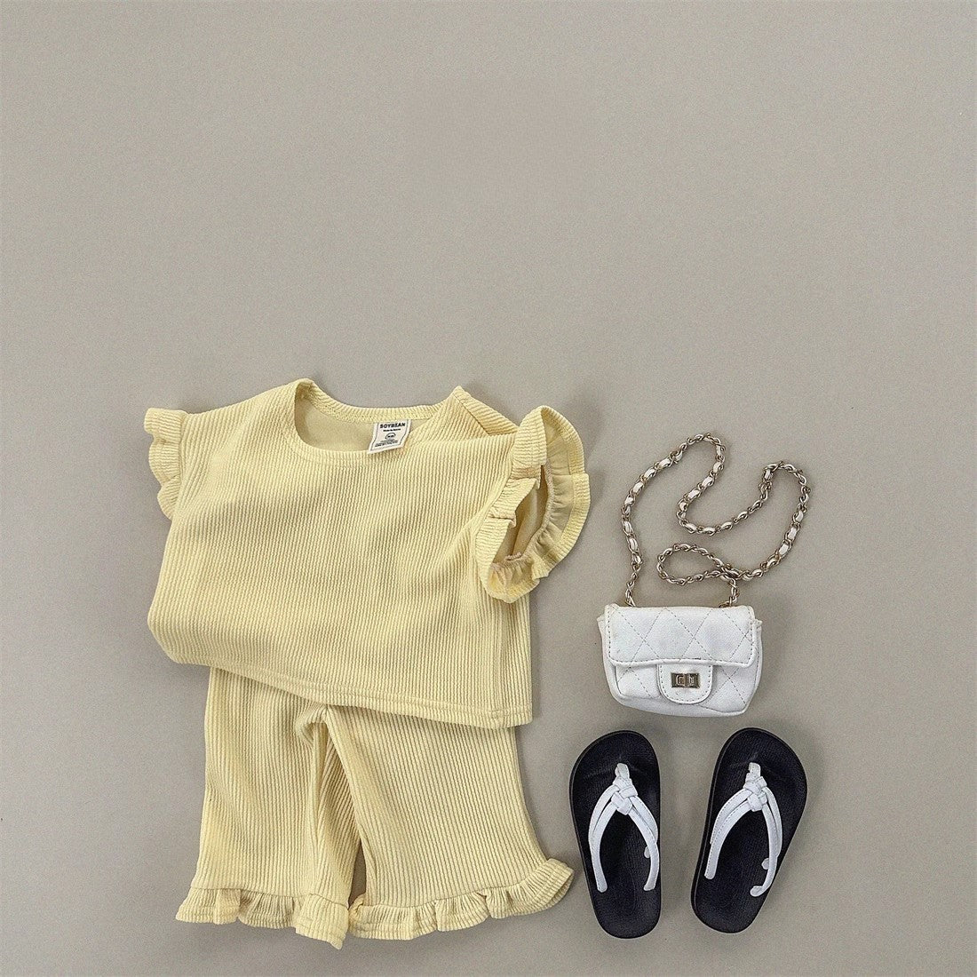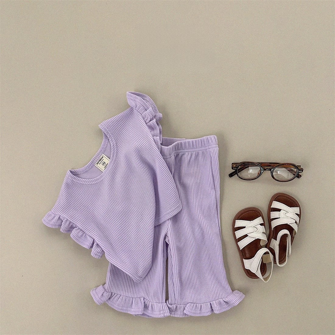 This summer outfit set features a soft, solid color T-shirt with airy fly sleeves and matching pants, designed for comfort and ease of movement. Perfect for everyday play or casual outings, it keeps your little girl cool and comfortable during warm days while offering simple style that’s easy to mix and match.