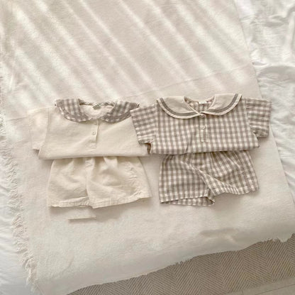 Summer Baby Kids Unisex Plaid Casual Navy Collar T-Shirt And Shorts Clothing Set