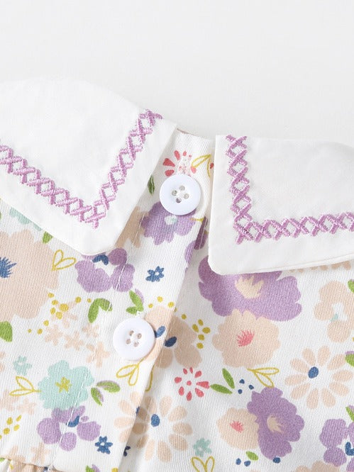 This exquisite baby girl bodysuit features delicate floral patterns and elegant fly sleeves, complemented by a finely embroidered collar. Designed for summer comfort, it combines breathable fabric with stylish details, ensuring your little one stays cool and charming throughout the day. A perfect blend of sophistication and practicality for your baby’s warm-weather wardrobe.
