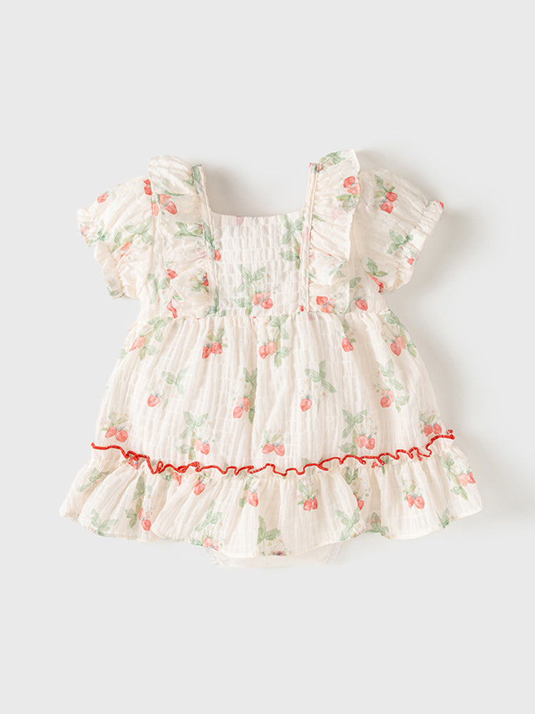 This charming baby girls’ dress features a delicate light fabric adorned with a playful fruits pattern, perfect for warm summer days. Designed with short sleeves for breathability, it combines comfort with a sweet, elegant style. Ideal for keeping your little one cool while adding a touch of refined charm to any summer outing.