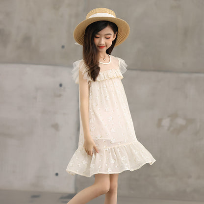 This elegant summer dress for girls features delicate mesh patchwork combined with a charming floral print, offering a light and breathable fit perfect for warm days. Its short sleeves provide comfort and ease of movement, making it an ideal choice for both casual outings and special occasions. Crafted with attention to detail, this dress blends style and comfort effortlessly for your child’s wardrobe.