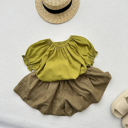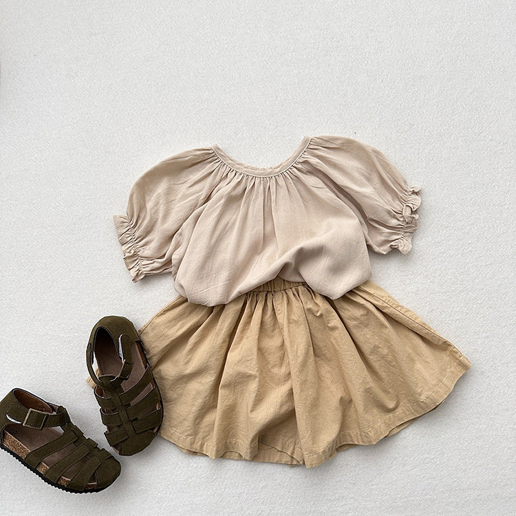 This summer essential features a soft, breathable fabric designed for comfort in warm weather. The delicate short puff sleeves add a charming touch, while the thin, solid color design ensures versatility for any outfit. Ideal as a base layer or standalone top, it offers both style and ease for active young girls.