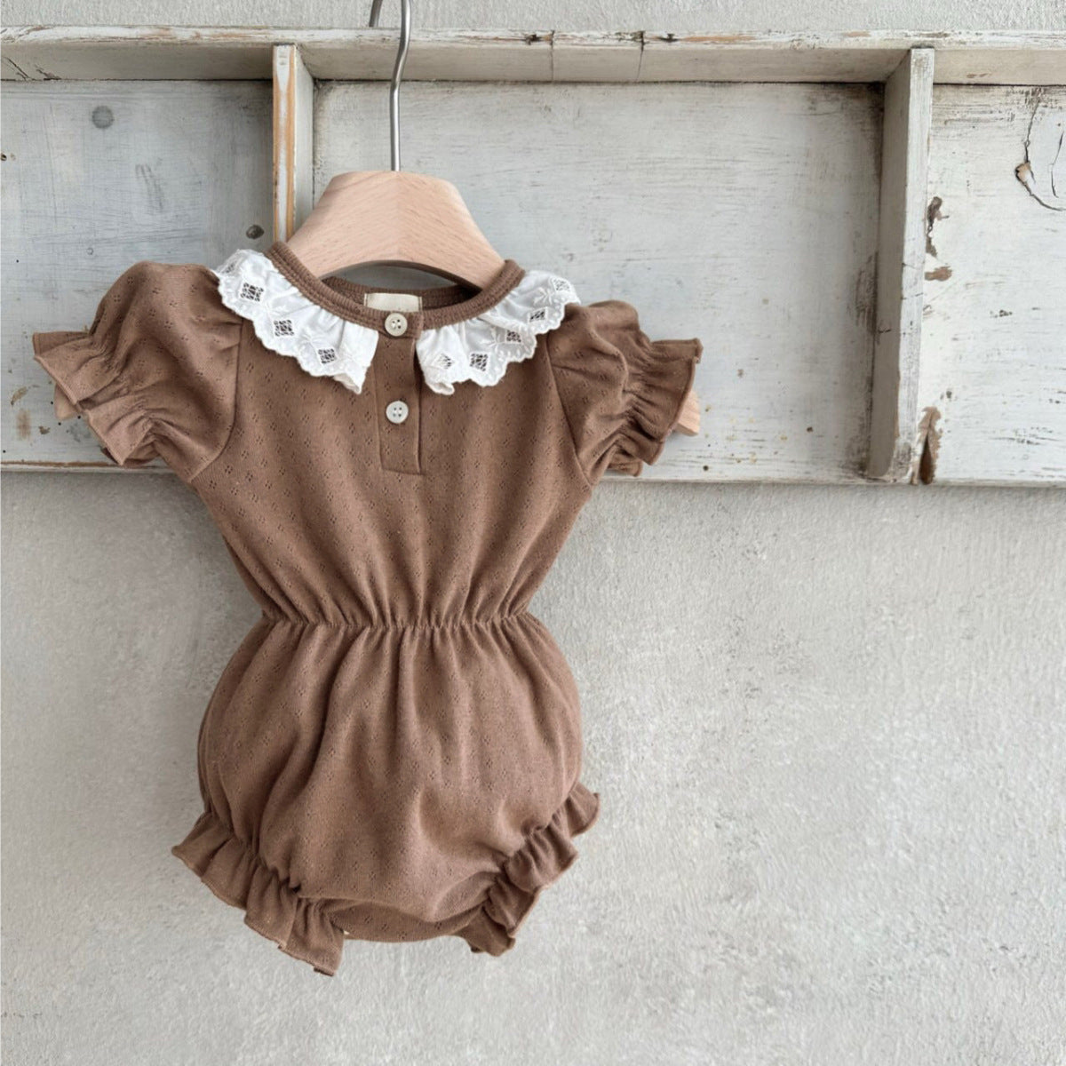 Celebrate the arrival of summer with this exquisitely designed baby girls' bodysuit. Featuring a delicate geometric pattern, a stylish collar, and short sleeves, it combines comfort with elegance. The hollow-out detailing adds a subtle breathability, keeping your little one cool during warm days. Perfect for any occasion, this bodysuit offers both a refined look and practical comfort for your baby’s summer wardrobe.