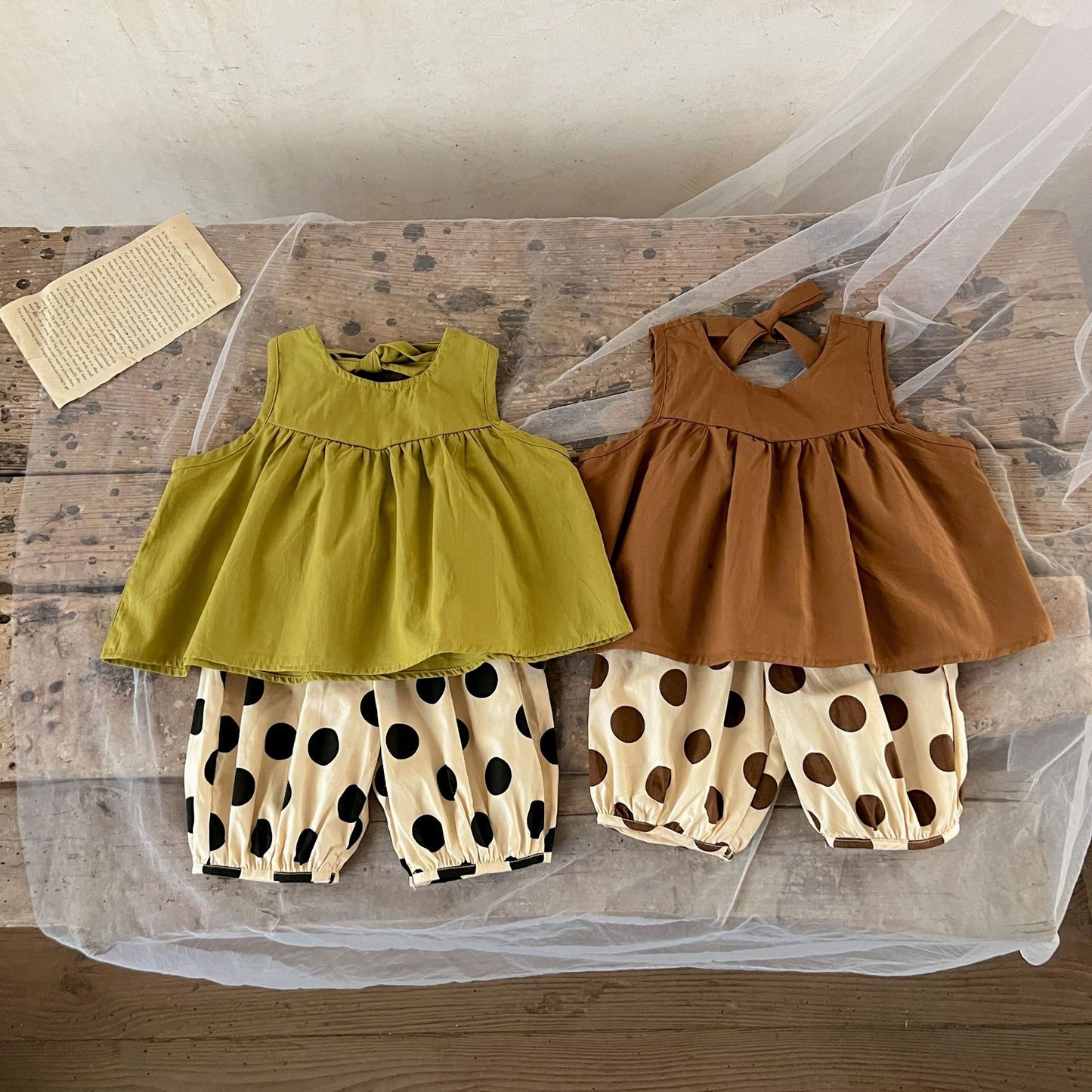 Keep your little one cool and cute this summer with this playful two-piece set! Featuring a sleeveless crew neck solid color top paired with fun polka dot shorts, this outfit brings comfort and style together. Perfect for sunny days and playful adventures, it’s designed to let your baby girl move freely while staying breezy and adorable.