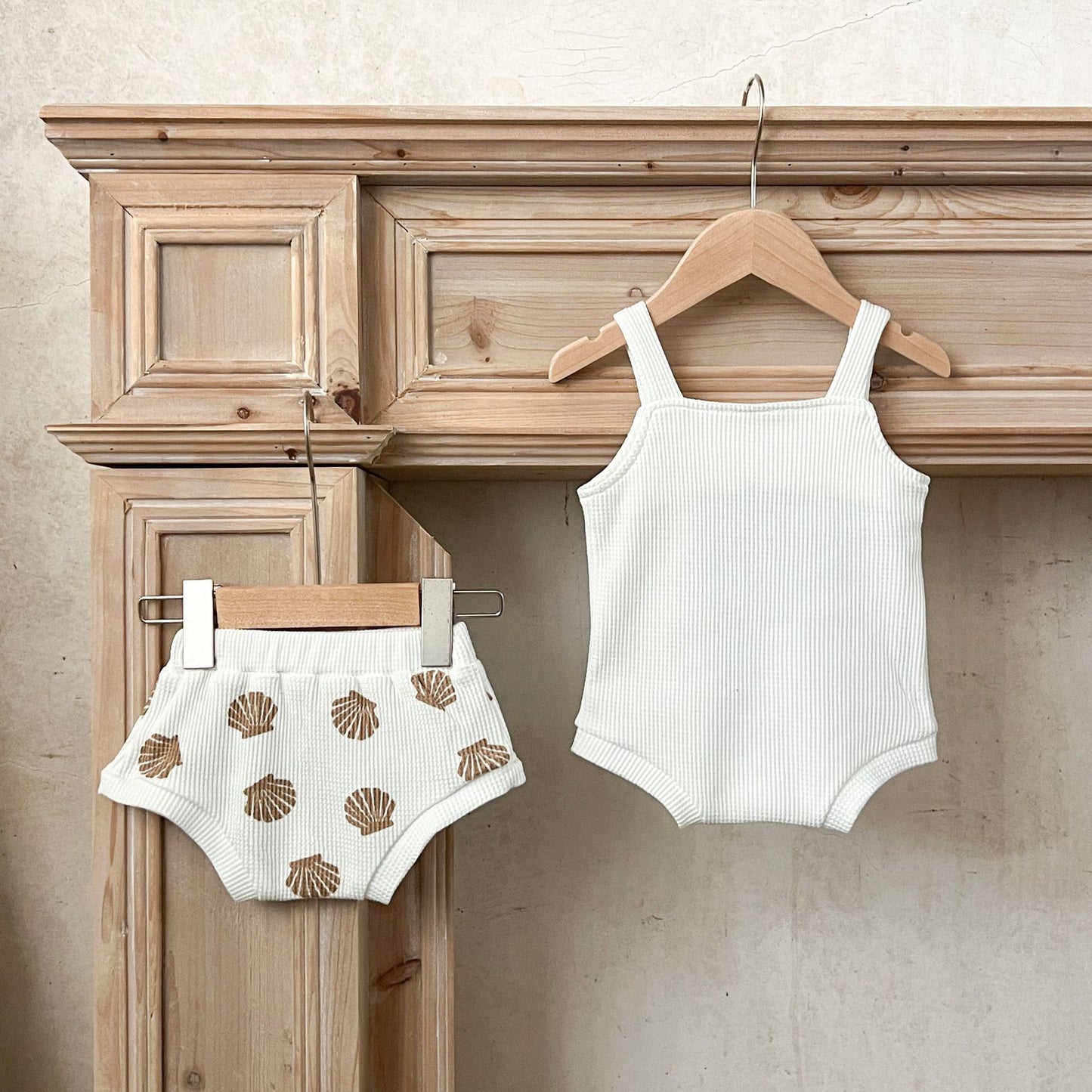 Keep your little one cool and adorable this summer with our sleeveless shell pattern bodysuit and bloomers set! Lightweight and comfy, this playful outfit lets your baby move freely while staying stylish. Perfect for sunny adventures and nap times alike, it’s a breezy, cute choice for warm days.
