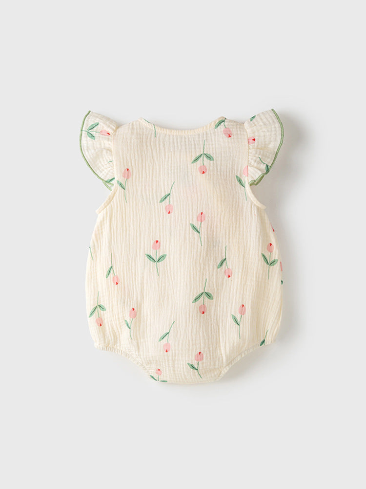 Dress your little sunshine in this playful summer bodysuit featuring light floral embroidery and fluttery fly sleeves. The soft fabric and comfy crew neck keep your baby girl cool and cute all day long. Perfect for sunny adventures and sweet snuggles!