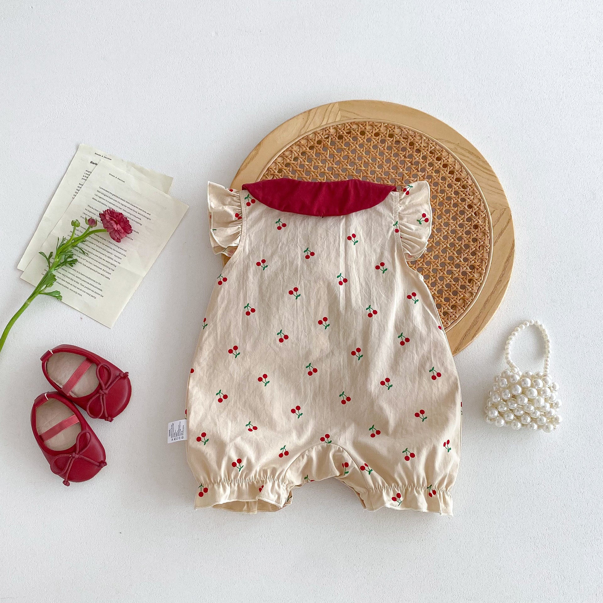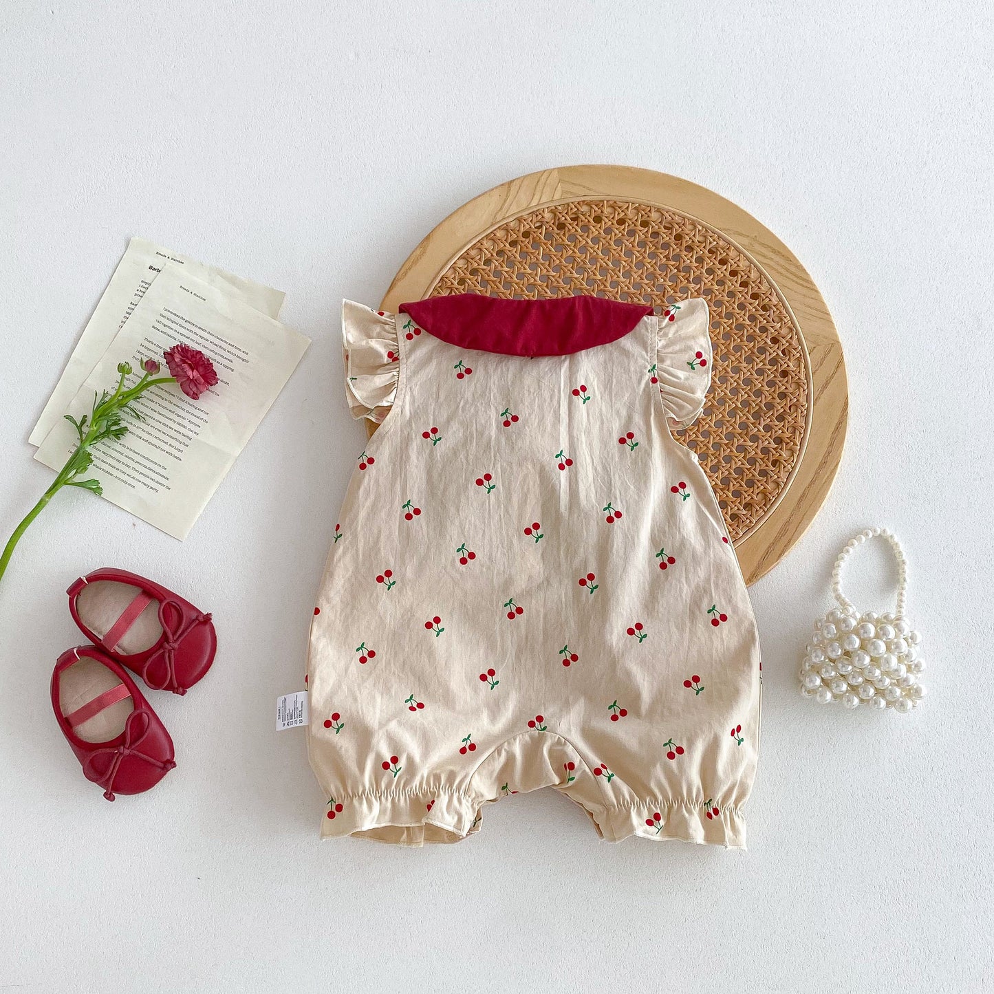 Keep your little one cool and cute this summer with these lightweight baby girls' bodysuit. Featuring adorable cherry prints, fluttery fly sleeves, and a charming Peter Pan collar, they're perfect for sunny days full of fun and giggles. Soft and breathable fabric ensures all-day comfort for your newest arrival.