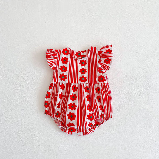 Design Summer Girls Flowers And Striped Pattern Fly Sleeves Onesies And Dress – Sister Matching Clothing Set