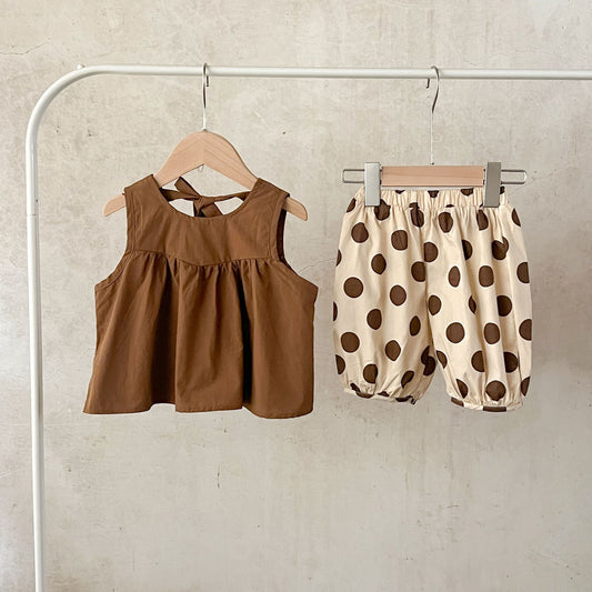 Summer Arrival Baby Girls Sleeveless Crew Neck Solid Color Top And Polka Dot Shorts Clothing Set