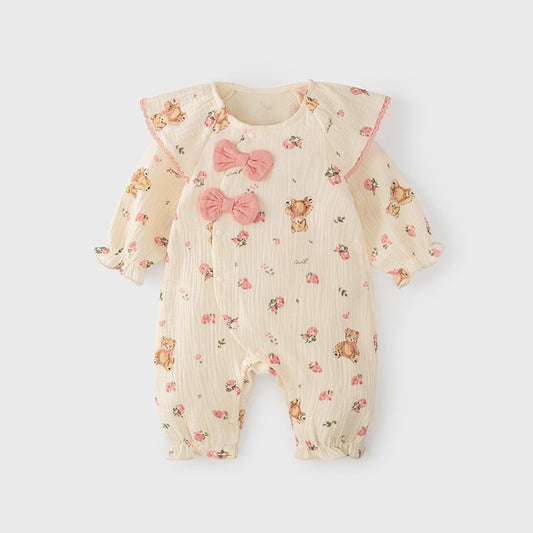 Autumn Arrival Baby Girls Flowers and Teddy Pattern Butterfly Bows Attached Romper