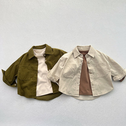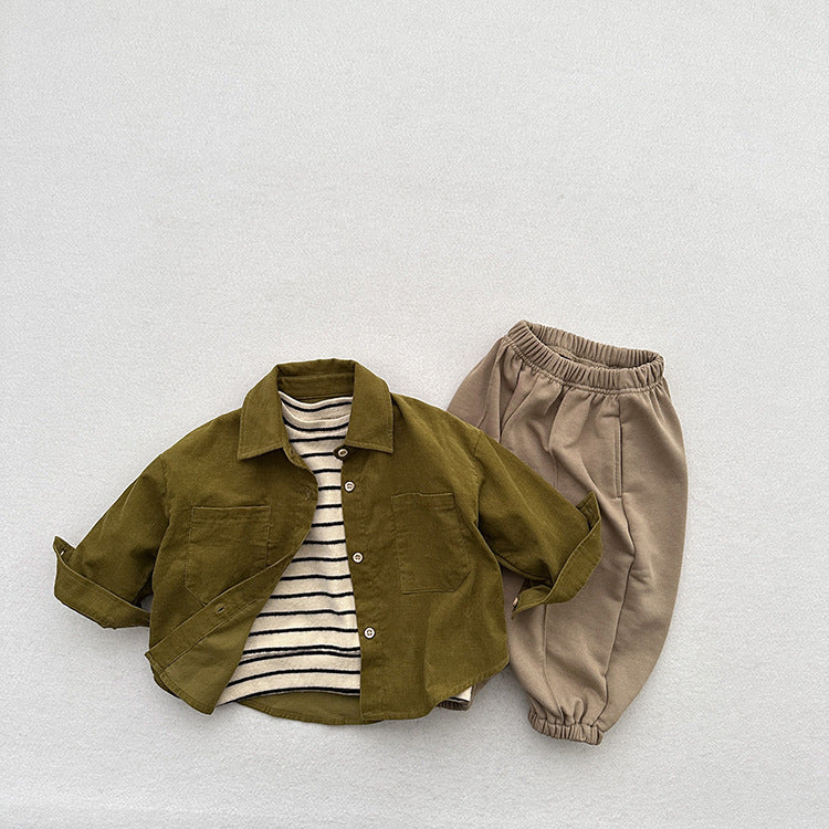 Spring Children’s Thin Shirts Baby Retro Solid Color Jackets For Boys And Girls Mountain Style Long-Sleeved Fine Striped Velvet Shirts