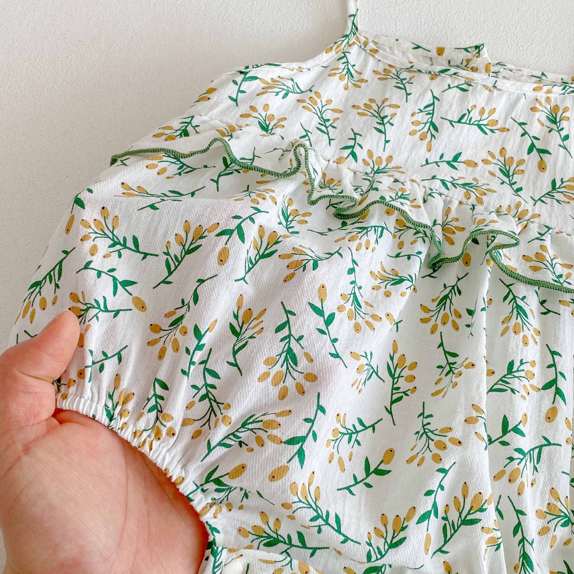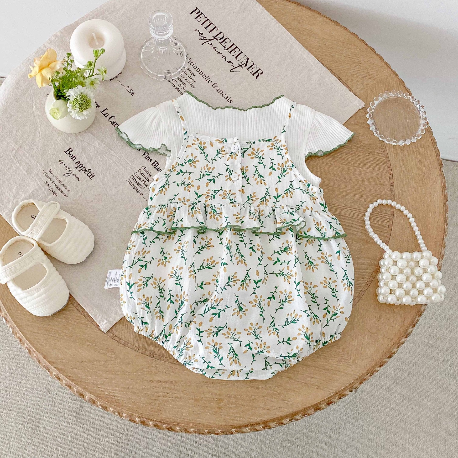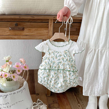 This elegant summer set features a finely knitted fly-sleeve T-shirt paired with charming floral strap bodysuit overalls, designed for baby girls. Crafted for comfort and style, the breathable fabric ensures ease of movement and keeps your little one cool during warm days. The delicate floral pattern adds a touch of sophistication, making this ensemble perfect for both casual outings and special occasions.