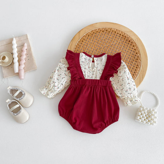 Spring Baby Flowers Print Color Patchwork Long Sleeves Onesie For Girls