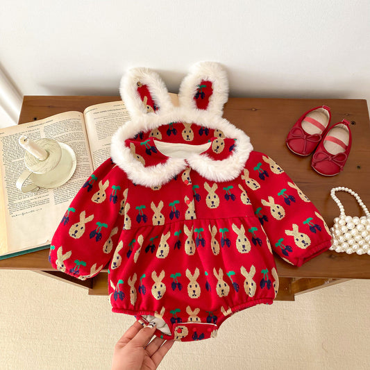 Infant Baby Girls Thick Warm Long Sleeve Rabbits Floral Knitted Round Collar Red Romper