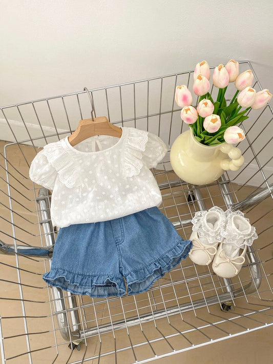 Summer Hot Selling Baby Girls Floral Embroidery Short Sleeves Top And Denim Shorts Clothing Set