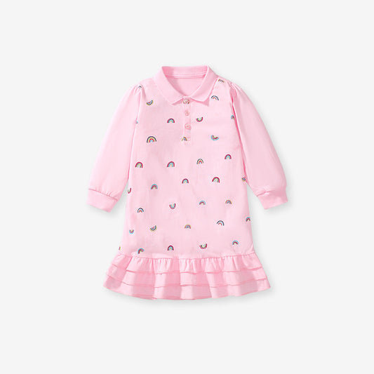 Spring And Fall Girls’ Rainbow Print Long Sleeves Polo Shirt Design Dress In European And American Style For Summer